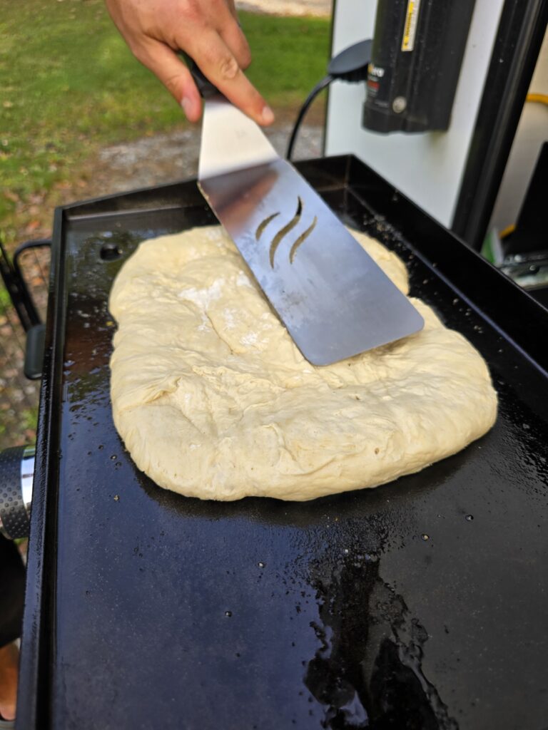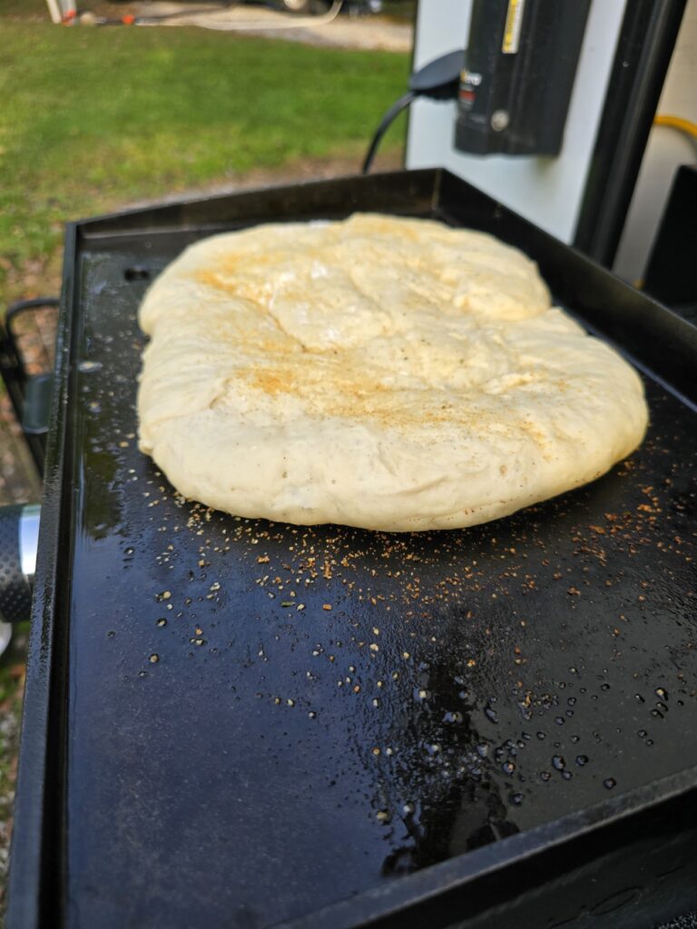 - Sprinkle the gridle with flavored bread crumbs if desired (a favorite of ours) and add the dough to the griddle.