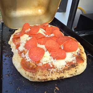 If you are cooking on the griddle, a grill dome is ideal. Get yours here. They make round ones, but ours is rectangular. Just be sure you buy one that fits the size of your griddle. Because you will be using this to melt your cheese on top and work like an oven, you will need to make sure when you roll out your dough, that it will fit under this cover. Bring it inside and put it over the dough as your roll it out, make sure it fits and you won’t be leaving some of the crust hanging out.