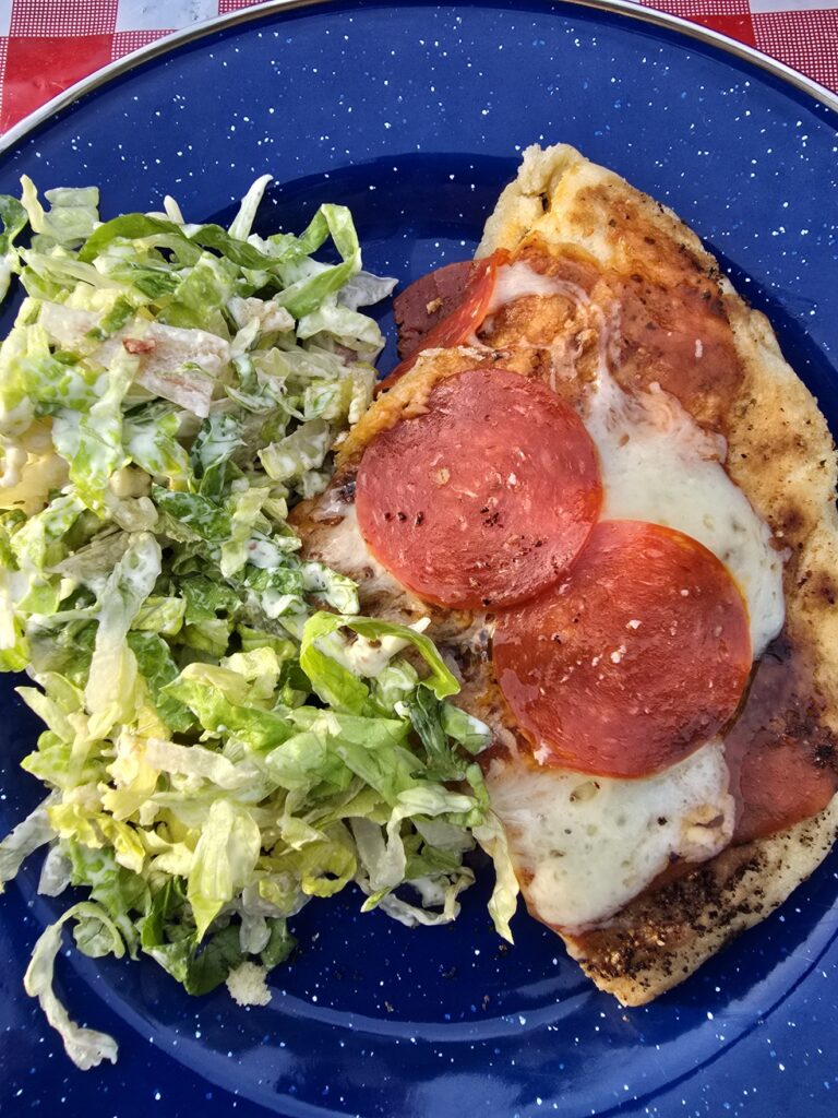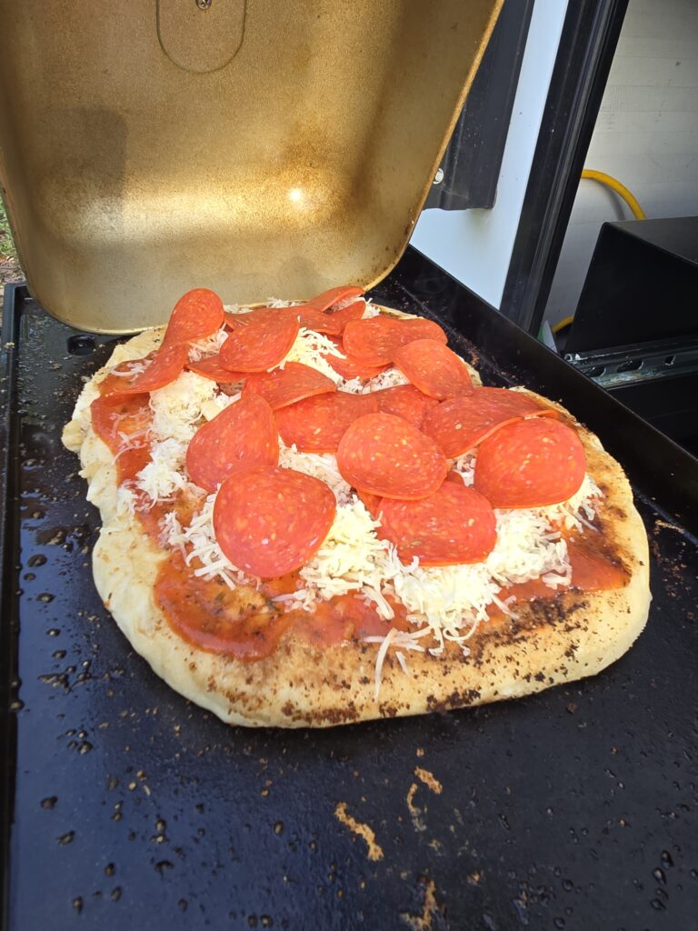 If you are in a camper, you have two real options for cooking your pizza now (without buying a pizza oven). Bake it in your oven or cook it on your camp griddle. We were used to cooking on our blackstone at home, so if it’s not raining, we cook outside on the griddle. If you are going to bake it instead, just spray your baking pan, push out your dough on it to fill the size of the pan, then cook the dough at 400 for about 8 minutes, then add toppings and cook another 8 minutes or so until cheese is melted.