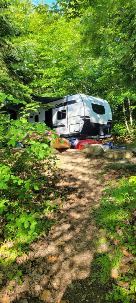 A year ago this month (July 2023) the lean-to photo was taken. It rained 3 of the 4 days we stayed there. We made the best of it. But before we left the campground that weekend, we walked the entire state park. We looked at all the sites and weighed the pros and cons of each one with one goal in mind: what site would be the best one to park our camper on next year. We had had enough of soaking wet camping gear. We picked a site that was waterfront so we could bring our kayaks and paddleboard, yet was big enough for a camper. What I was afraid would happen is we would end up not getting a camper and we’d be stuck again with a beautiful site and our little tent, in the rain. Either way, we had site 27 booked.