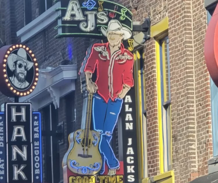 The center of Nashville – a madhouse. What were we thinking driving there on a Saturday evening? There were bridal parties, tourists, locals, you name it! We drove down the center of it and did not stop. But did get an image of Alan Jackson’s bar for my grandmother!