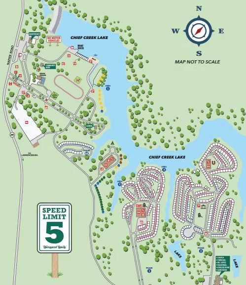 This is not a Thousand Trails where you get to pick your site. This one is assigned to you, and our given site was 215, which was to the left of the playground in the bottom right of the map. It was fairly easy to navigate to, but keep a close eye on the one-way roads and signs to get there. Some are narrow, and not everyone abided by the signs.